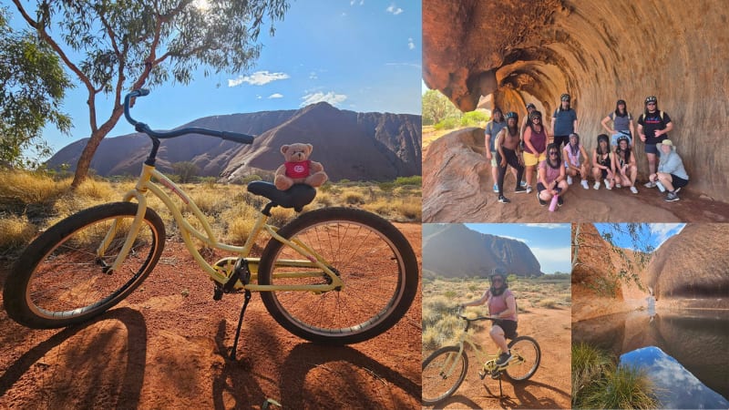 The next day, after breakfast at Ilkari Restaurant at Sails in the Desert, we joined Outback Cycling for a guided bike tour around the base of Uluru. Wearing helmets and fly nets, we rode past sacred sites as our guides shared stories from Anangu culture, explaining where photography is respectfully restricted and why.