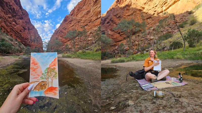 My favourite experience in Alice Springs was an art session with Art Tours of Australia at Simpsons Gap. Surrounded by rust-red cliffs in the peaceful desert gorge, we painted watercolour landscapes under Anna’s kind guidance.
